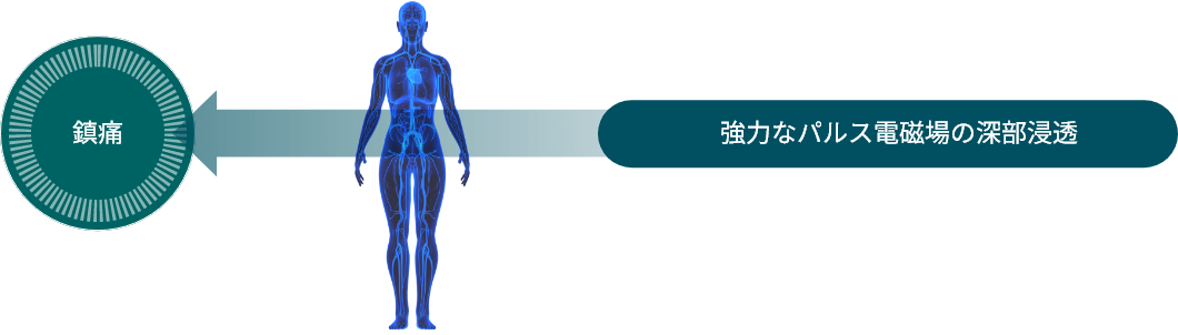 電磁場が痛みを緩和します。人体に直接電流を流すことはなく、非接触で誘導電流を発生させます。